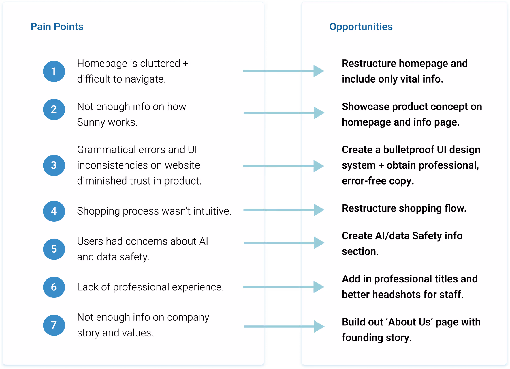 Once we had identified user pain points, we translated them into opportunities for the redesign.